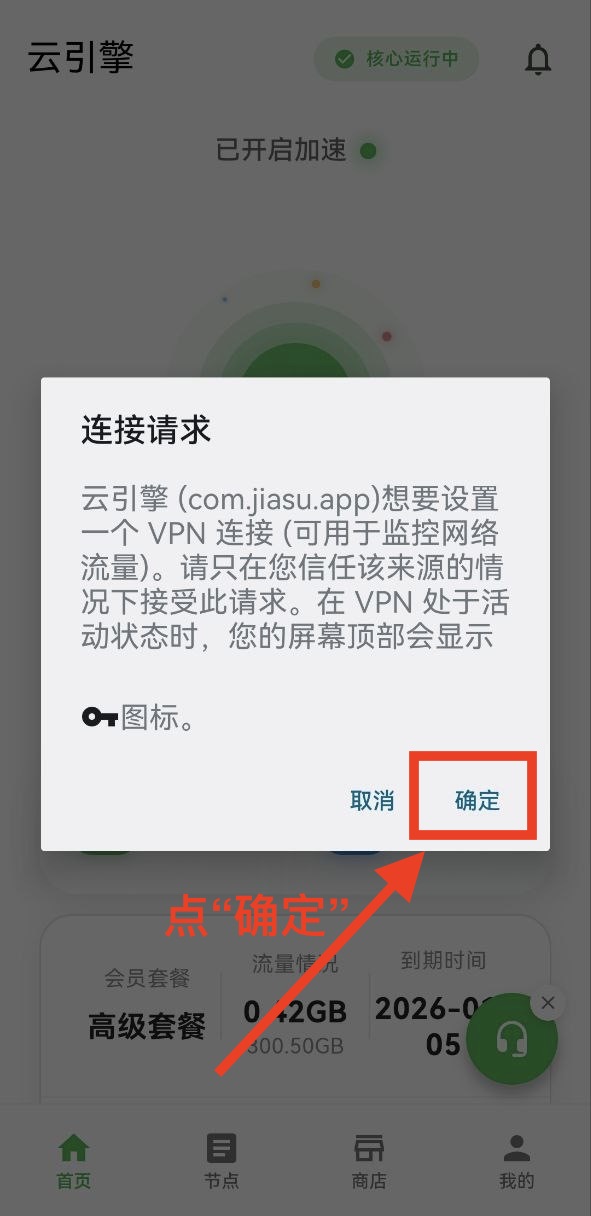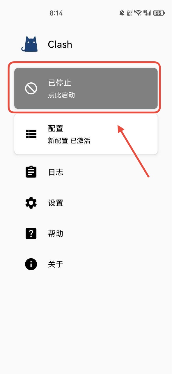 然后返回Clash主页面,点击灰色“已停止”启动,第一次会有一个弹窗,点击确认即可,看到变成蓝色就启动成功了
