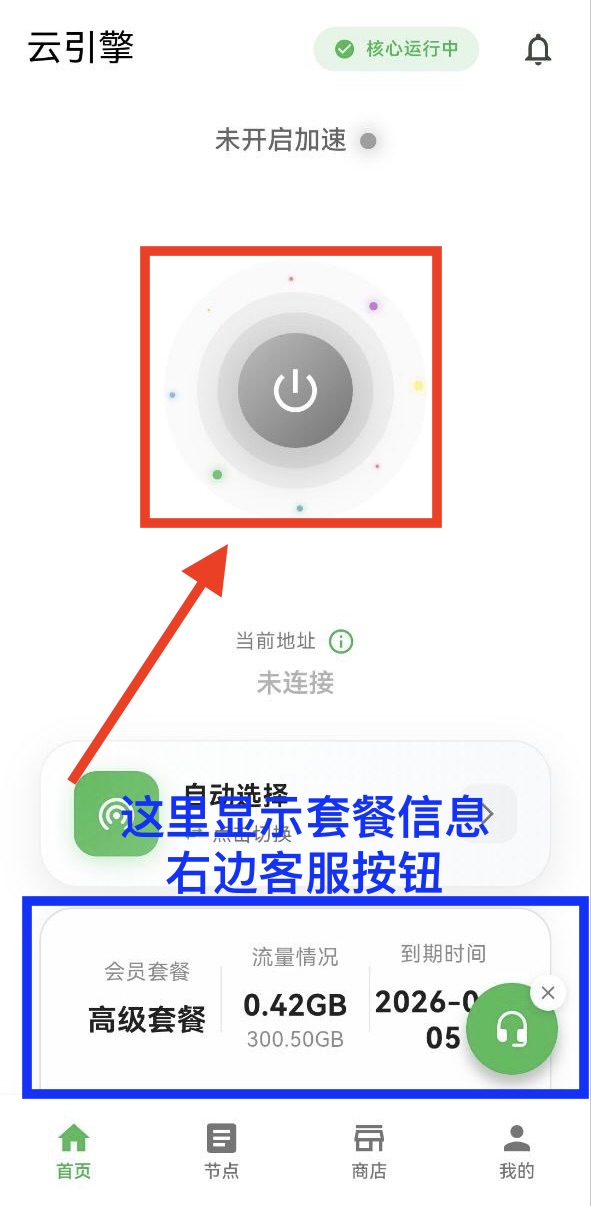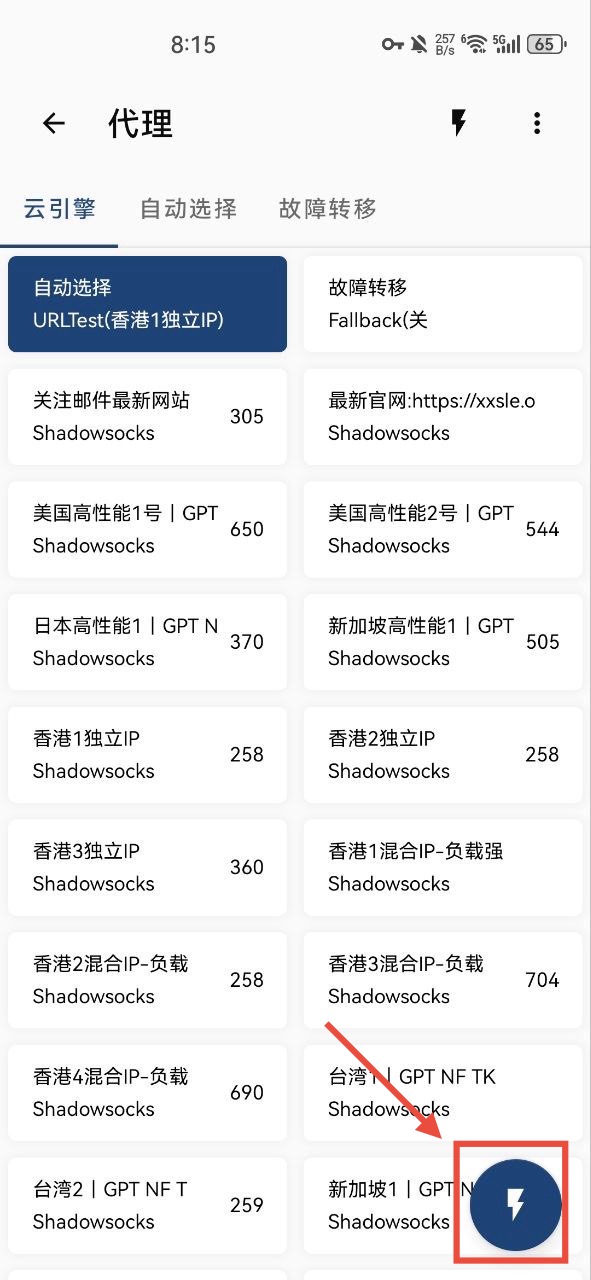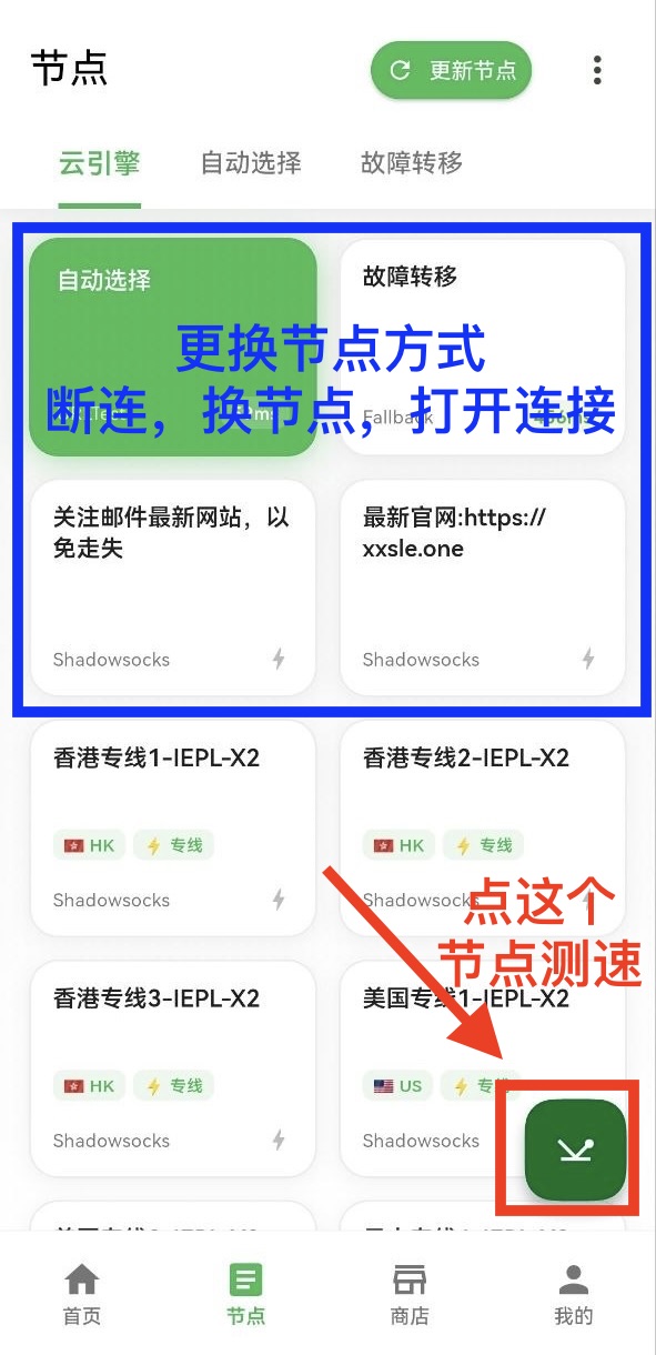 点击软件下方“节点”,查看如何更换节点,测速相关技巧