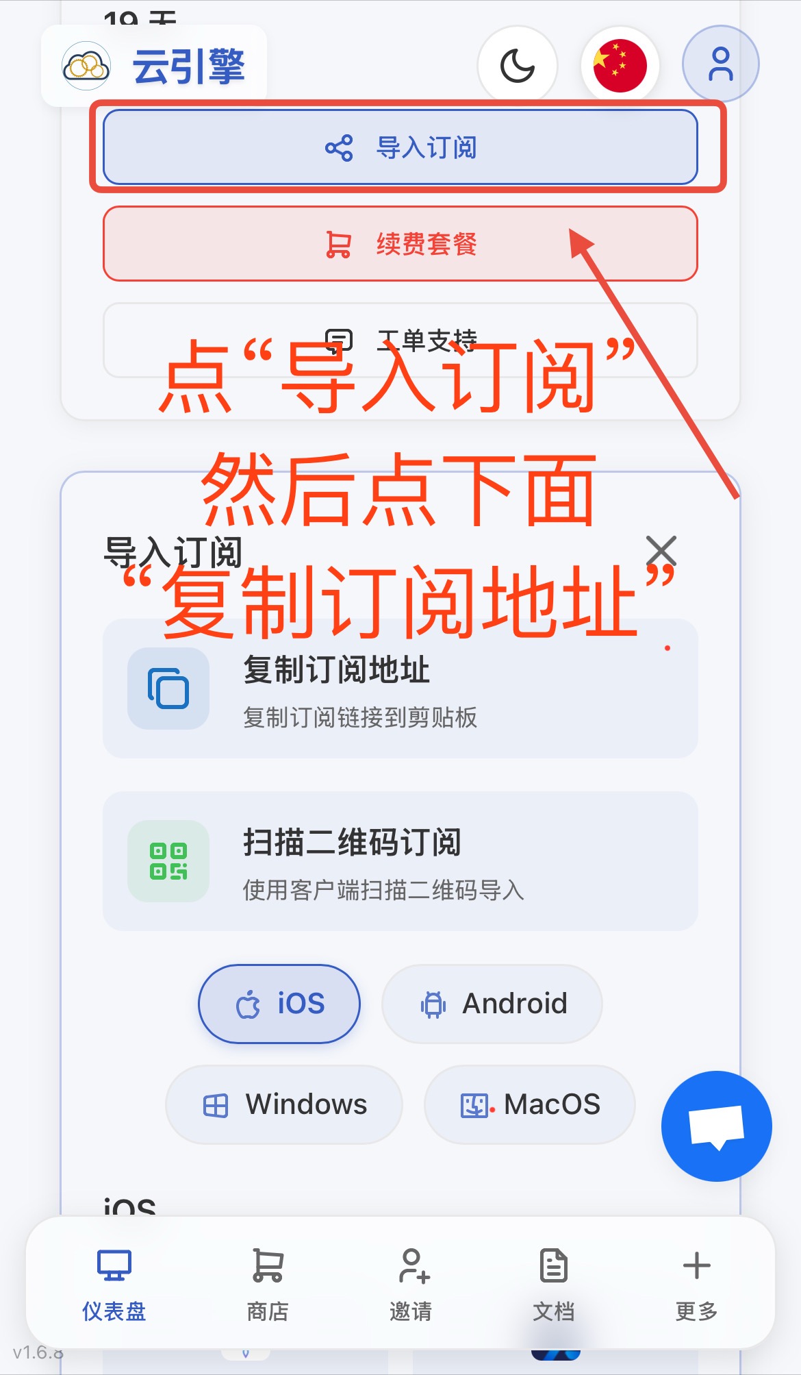 点击左下角“仪表盘”,往下划点击“导入订阅”,然后点“复制订阅地址”